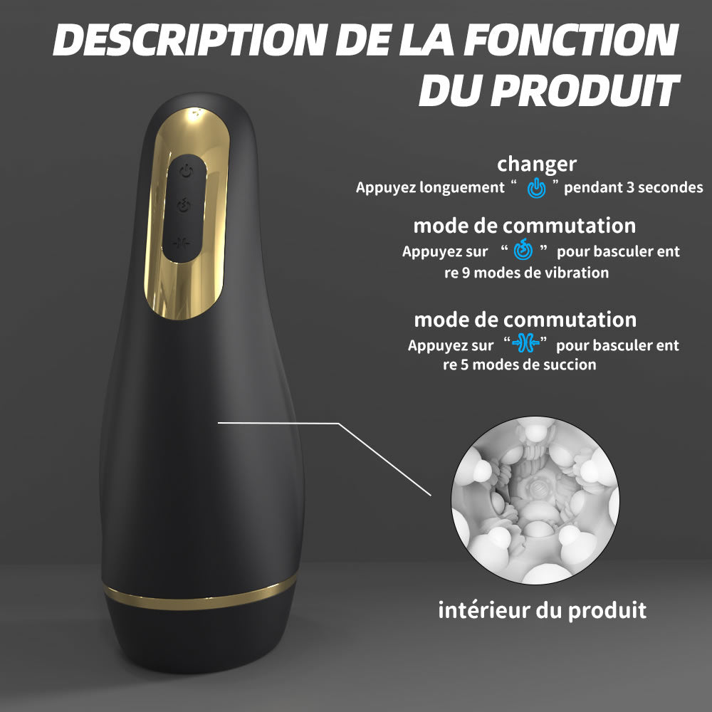 Mode : vibration à 9 fréquences + aspiration à 5 fréquences et dégonflage + aspiration
