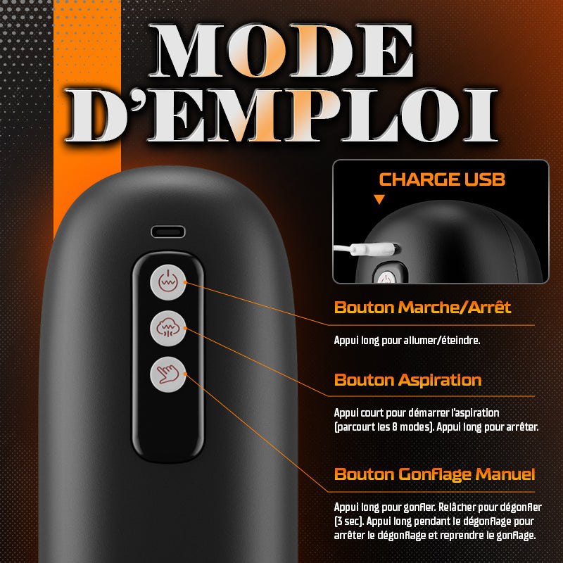 Un appui et BOUM : une aspiration écrasante frappe votre point le plus sensible comme la foudre. Le plaisir surgit de votre tige directement vers votre cerveau, vous laissant l'esprit vide et explosant dans l'orgasme le plus féroce.